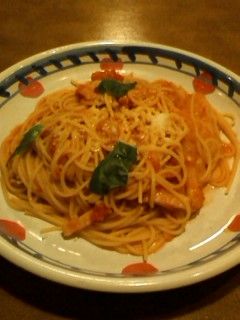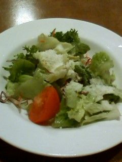 最近、ジョリーパスタにハマってまして。一部の店舗限定やと思うけど、今だけ\399のパスタがあるので、お得。これも、そのパスタの内の一品。サラダは別で。